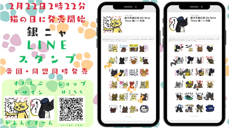 LINEスタンプは銀河帝国の人々が猫になった「銀ニャ帝国」24種と、自由惑星同盟のキャラクターが猫になった「自由ニャン星同盟」24種。勇ましく「ニャイエル!」と発する様子や、みんなで「プニャージット!」と声を揃える姿が描かれた。どのキャラクターがどのように猫化したのかはスタンプで確認してみよう。購入にはそれぞれ100LINEコインが必要となる。