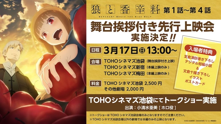 TOHOシネマズ池袋の会場では、本編上映後にホロ役・小清水亜美が登壇する舞台挨拶も行われる。TOHOシネマズ池袋のチケットは明日2月26日10時にプレリザーブ受付を開始。当落結果は3月8日18時頃から順次発表される。TOHOシネマズ新宿、TOHOシネマズ梅田のチケットは、3月14日24時に販売を開始する。