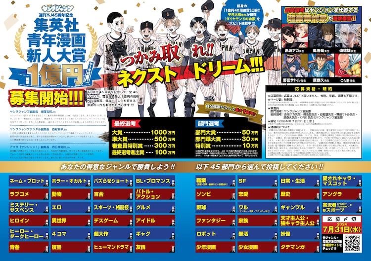 各部門大賞から上位10作品が最終選考に進み、その中から選ばれる大賞作品の作者には賞金1000万円を贈呈。大賞を選出する最終選考の審査員には、赤坂アカ、奥浩哉、迫稔雄、野田サトル、原泰久、ONEが名を連ねた。なお同マンガ賞の賞金総額は最大1億円だ。応募は本日2月29日から7月31日まで受け付けている。また週刊ヤングジャンプ、となりのヤングジャンプ、ヤンジャン!の各編集長からはコメントも到着した。