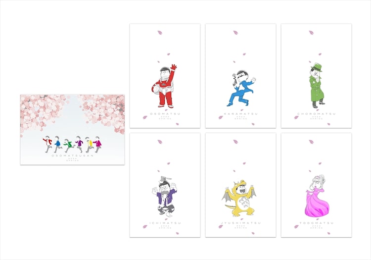 3月15日から18日まで全国の6劇場にて上映される「えいがのおそ松さん5周年記念 春のおそ松さん同窓会~センバツもまたやるよ~」は、初の長編劇場作品「えいがのおそ松さん」と、TVアニメ第1期のエピソードを6つにわけた特別編集版「春の全国大センバツ上映祭」のリバイバル上映イベント。来場者特典のポストカードは、淡い桜と高校時代の6つ子が描かれた「えいがのおそ松さん」ポストカード1種類と、6つ子がSF、ミステリー、ホラーなど映画をテーマとした衣装に身を包んだ「春の全国大センバツ上映祭」ポストカード6種類の計7種類が用意された。それぞれ上映作品に応じたポストカードがプレゼントされる。