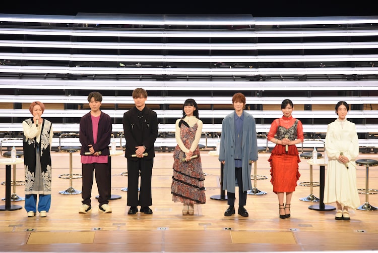 左から田村睦心、入野自由、竹内栄治、本泉莉奈、七海ひろき、福原綾香、釘宮理恵。