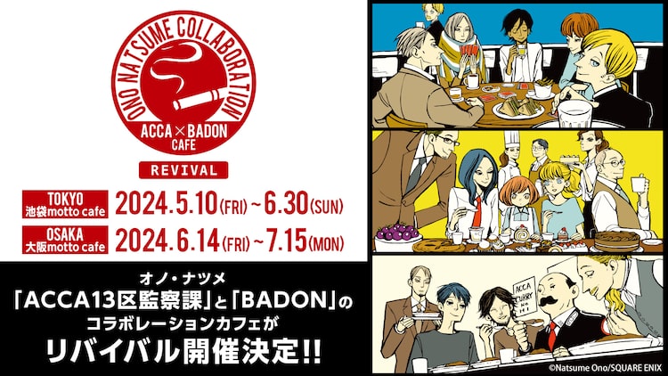 「ACCA×BADONカフェ」は、オノ・ナツメによる「ACCA13区監察課」と「BADON」の世界観を表現したコラボカフェ。2019年から2020年にかけて東京、大阪、愛知で開催された。リバイバル開催となる「ACCA×BADON COLLABORATION CAFE REVIVAL」は、5月10日から6月30日まで東京・motto cafe 池袋店、6月14日から7月15日まで大阪・motto cafe 大阪店で開催される。メニュー情報などの詳細は後日アナウンスされる予定だ。