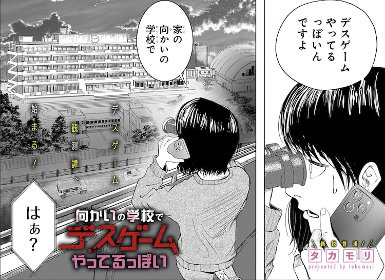タカモリの読み切り「向かいの学校でデスゲームやってるっぽい」が、本日4月6日に少年ジャンプ+に掲載された。