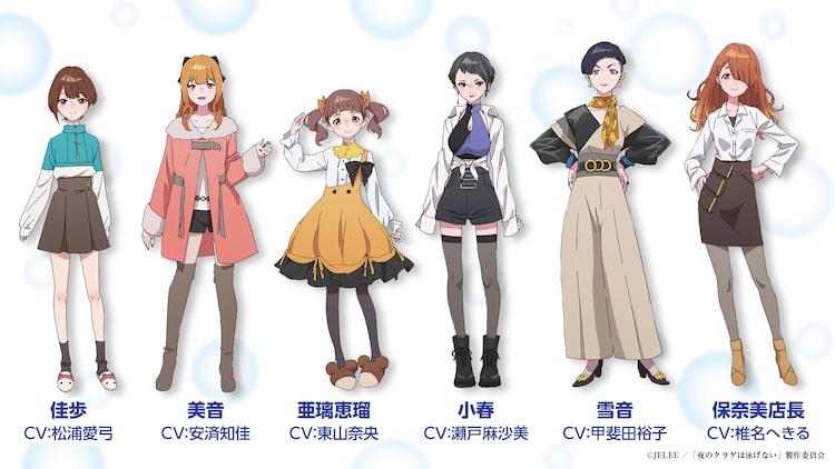 本日よりTOKYO MX、関西テレビ、BS11ほかで順次放送されている「夜のクラゲは泳げない」。追加キャストとして発表されたのは、佳歩役の松浦愛弓、美音役の安済知佳、亜璃恵瑠役の東山奈央、小春役の瀬戸麻沙美、雪音役の甲斐田裕子、保奈美店長役の椎名へきるの6人だ。どんなキャラクターかは本編での活躍を待とう。