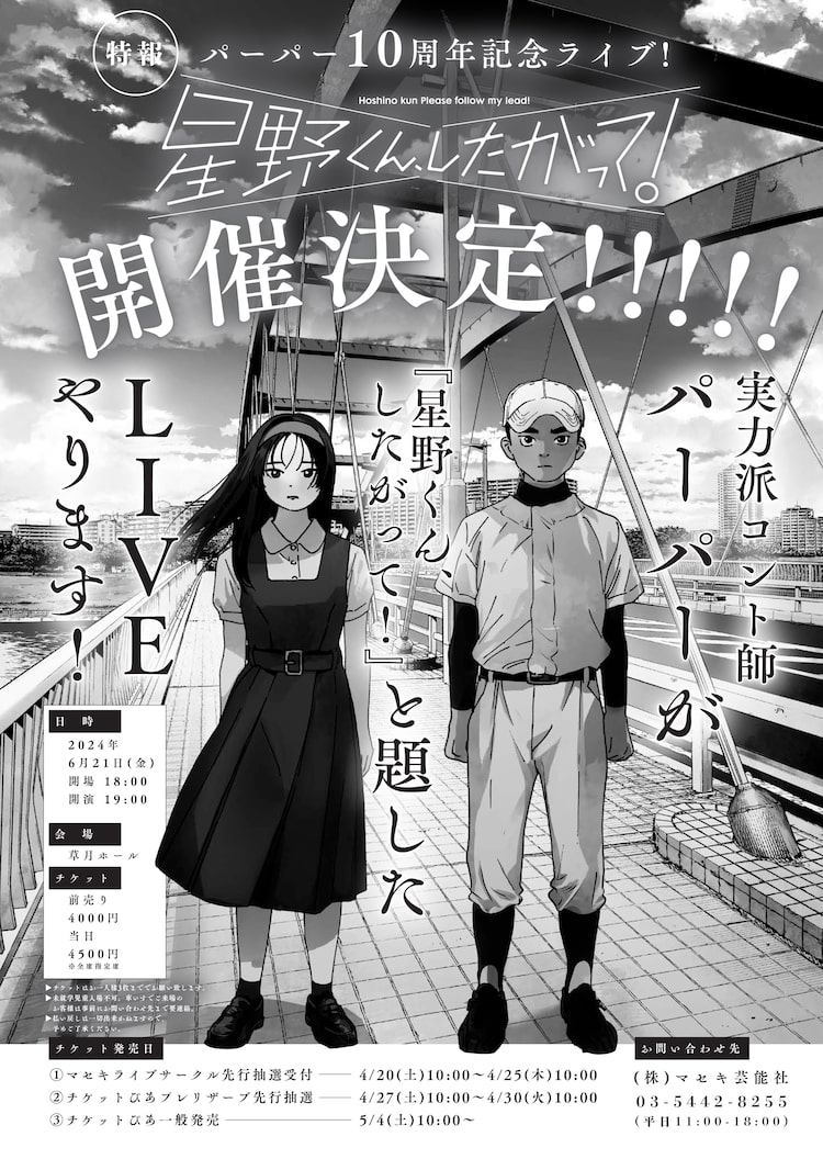 このたび、パーパー結成10周年の節目としてライブを行うことになりました。現在週刊スピリッツさんで連載させていただいている「星野くん、したがって!」の星野くんと山田さんをパーパー2人で演じます。マンガを読んでくださっている方も、パーパーのコントを好きでいてくれている方にも楽しんでもらえるような内容にしたいと思っています。配信はありませんし、コンビ仲的にも1回限りの公演になるので、皆さんぜひこの機会に観に来ていただきたいです!