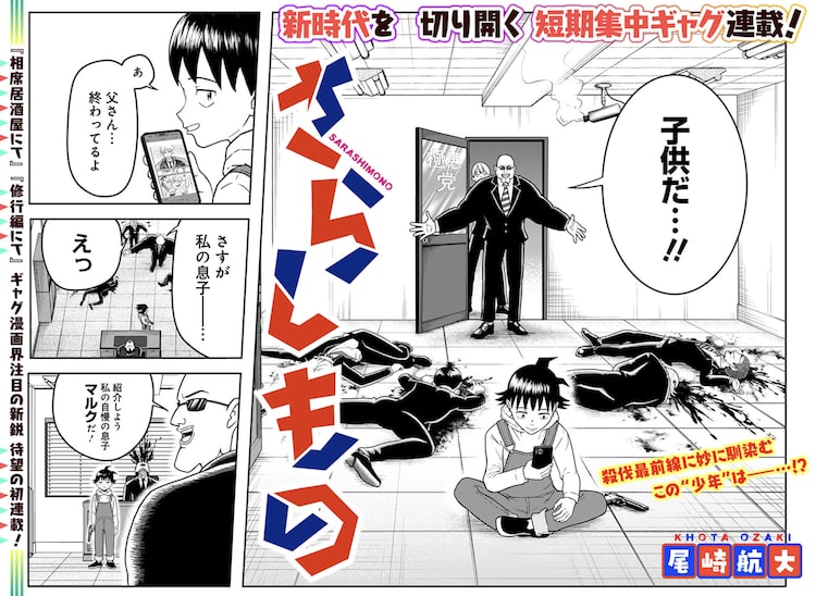 「さらしもの」は殺し屋事務所のボスの息子である、小学4年生の少年・丸岡マルクを主人公に描くギャグ。幼い頃から父親から殺人術を叩き込まれた殺し屋のエリートであるマルクは、この世界がマンガや映画の中であるなら自分は主人公側の人間だと思いこんでいた。しかしある日、引退した伝説の殺し屋を相手にすることになったことから、マルクは己の立場を疑問視し始める。