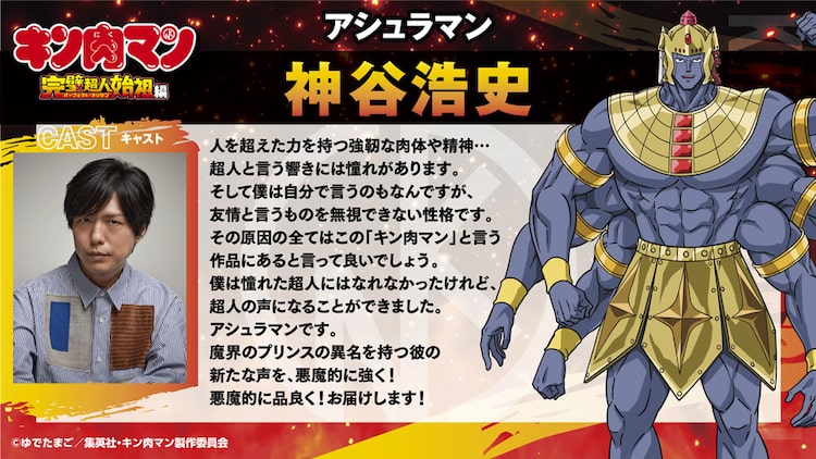 3人からは熱のこもったコメントが到着。神谷は「僕は憧れた超人にはなれなかったけれど、超人の声になることができました。アシュラマンです。魔界のプリンスの異名を持つ彼の新たな声を、悪魔的に強く!悪魔的に品良く!お届けします!」と意気込む。杉田は「行くぞ武道!」と、ネプチューンマンとしてタッグを組む超人のビッグ・ザ・武道に呼びかけ、太田は「熱い戦いを邪魔しないように、その熱い戦いをしっかりお伝えできるように頑張っていきたいと思います」と力強く述べた。