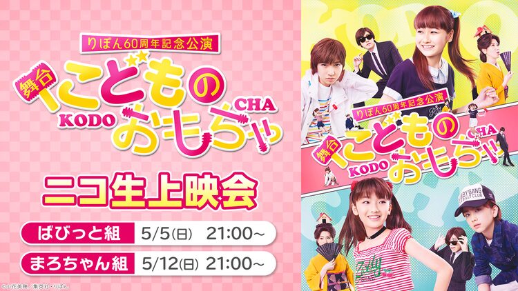 りぼん60周年記念公演として2015年に上演された舞台「こどものおもちゃ」。脚本・演出は1996年のアニメ版でも監督を務めた大地丙太郎が担当した。5月5日21時からは紗南役を奥田こころ、羽山役を相澤侑我が務めた「ばびっと組」の公演が、12日21時からは紗南役を小椋梨央、羽山役を板垣李光人が演じた「まろちゃん組」の公演が上映される。なお番組の後半は2.5次元やっぱニコメンチャンネル会員のみ視聴できるため注意しよう。