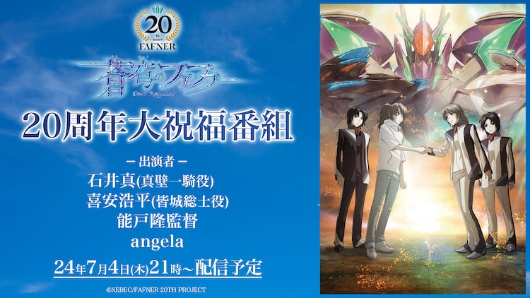 特番「蒼穹のファフナー20周年大祝福番組」には、真壁一騎役の石井真、皆城総士役の喜安浩平、能戸隆監督、「蒼穹のファフナー」シリーズの主題歌を多数手がけてきたangelaが出演。番組内では、20周年プロジェクトの新情報も発表される。また番組内で読み上げられるお祝いコメントの募集もスタート。5月30日まで「蒼穹のファフナー」20周年特設サイトのフォームより応募できる。