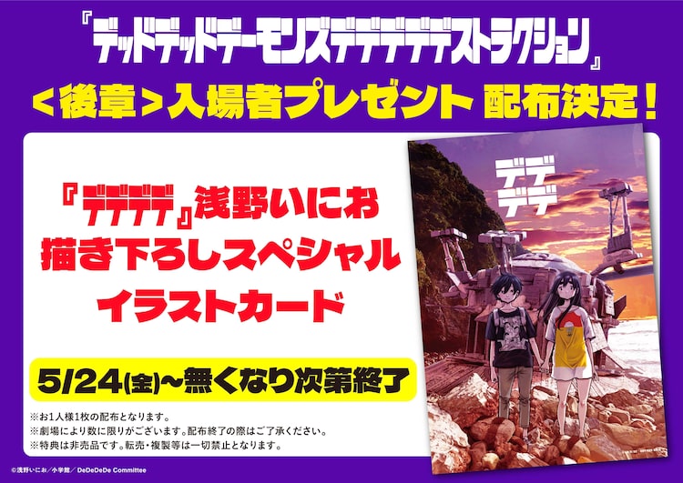 また入場者プレゼントとして、後章公開日の5月24日より浅野描き下ろしのイラストカードが配布されることが決定。イラストには手をつなぐ凰蘭と大葉の姿が描かれた。さらに後章公開の前日5月23日18時30分からは、前章・後章の一挙上映を全国の劇場で実施。実施劇場は「デッドデッドデーモンズデデデデデストラクション」の公式サイトで確認を。