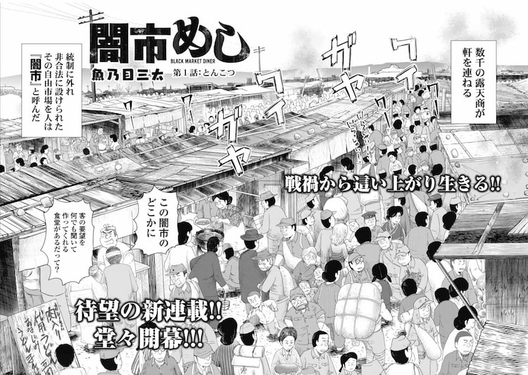 魚乃目三太のショート新連載「闇市めし」が、本日5月17日発売の週刊漫画ゴラク5月31日号(日本文芸社)でスタートした。第二次世界大戦が終戦した日本・上野で展開された闇市を舞台に描かれるグルメショートだ。