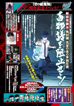 「百物語を阻止せよ!」は加藤発案のイベントで、怪談とコラボした内容。アニメで奥村燐役を務める岡本信彦のほか、怪談師の吉田悠軌、夜馬裕、村上ロック、牛抱せん夏が出演する。イベントでは奥村燐が「百物語を阻止せよ!」との指令を受け、真夏の夜に単独任務に挑むという設定のオリジナルストーリーを加藤描き下ろしのイラストとともに展開。さらに怪談師4人によるオリジナルの怪談エピソードが披露される。本日6月4日発売のジャンプスクエア7月号(集英社)では、加藤描き下ろしのイベントキービジュアルも公開された。