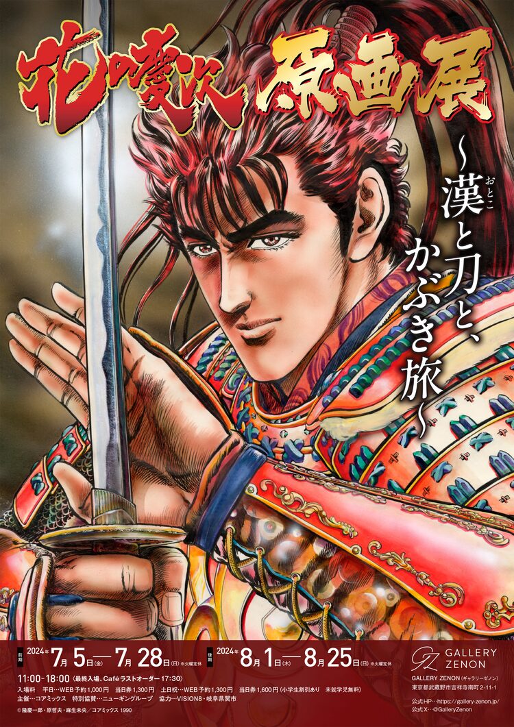 「花の慶次 原画展 ~漢と刀と、かぶき旅~」は7月5日から28日を前期、8月1日から25日を後期と区切り、前期と後期で展示作品の入れ替えを予定。合わせて約200点以上の生原画が展示される。コラボカフェ、グッズショップも併設。チケットは6月7日正午から販売される。料金は平日がWeb予約1000円、当日券1300円。土日祝日はWeb予約1300円、当日券1600円になる。