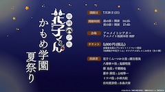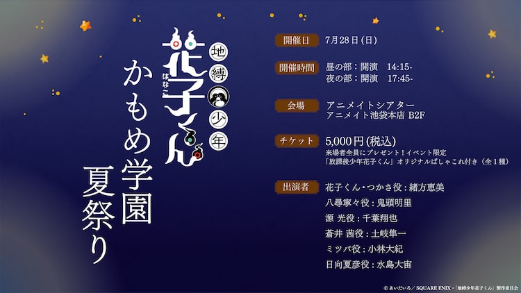 「『地縛少年花子くん』かもめ学園夏祭り」には、花子くん / つかさ役の緒方恵美、八尋寧々役の鬼頭明里、源光役の千葉翔也、蒼井茜役の土岐隼一、ミツバ役の小林大紀、日向夏彦役の水島大宙が登壇。秋から放送予定のショートアニメ「放課後少年花子くん」続編より2話分が先行上映されるほか、キャストによるトークやバラエティーコーナーなどが行われる。イベントは、昼・夜の2部制で実施。チケット料金は全席指定の5000円で、プレイガイド先行の申込みを6月30日23時59分までイープラスにて受け付けている。