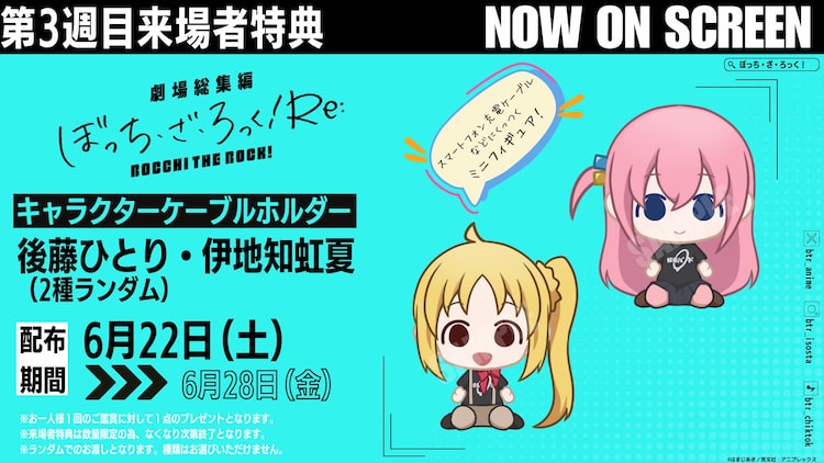 キャラクターケーブルホルダーは、スマートフォン充電ケーブルなどに付けることができるミニフィギュア。種類は後藤ひとりと伊地知虹夏の2種で、いずれか1つがランダムで手に入る。併せて「劇場総集編ぼっち・ざ・ろっく! Re:/Re:Re:」の追予告映像も公開された。