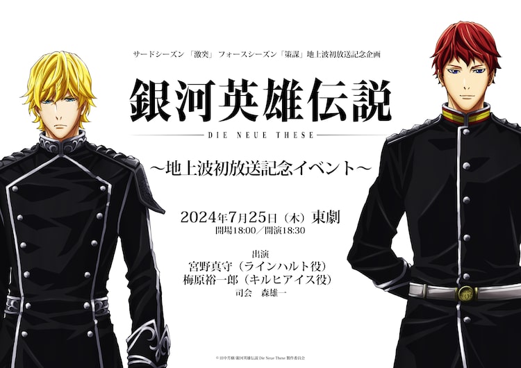 アニメ「銀河英雄伝説Die Neue These」のサードシーズン「激突」とフォースシーズン「策謀」の地上波初放送を記念したイベントが、7月25日に東京・東劇にて開催。イベントにはラインハルト役の宮野真守、キルヒアイス役の梅原裕一郎が登壇する。