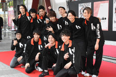 「ハイパープロジェクション演劇『ハイキュー!!』展」オープニングセレモニーより。前列左から、ウォーリー木下、小坂涼太郎、木村達成、三浦海里。後列左から、冨森ジャスティン、猪野広樹、秋沢健太朗、須賀健太、塩田康平、橋本祥平、川原一馬。 (c)古舘春一/集英社・ハイパープロジェクション演劇「ハイキュー!!」製作委員会