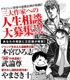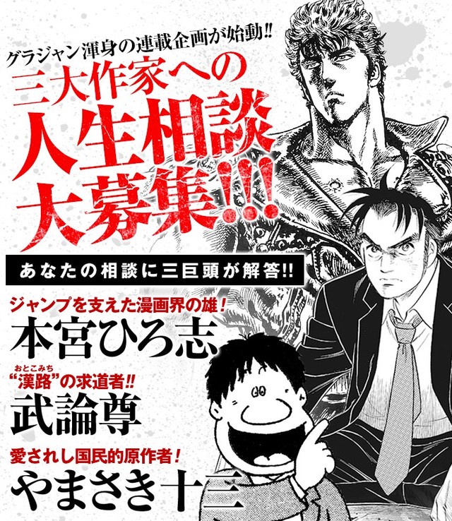本宮ひろ志、武論尊、やまさき十三の人生相談企画「儂に訊くな!」で悩み解決 2018年1月4日2018年1月4日 editor グランドジャンプの公式サイトより。本宮ひろ志、武論尊、やまさき十三による人生相談コーナー「儂に訊くな!」がグランドジャンプ(集英社)にてスタートする。 「儂に訊くな!」では採用された1件の相談に対し、毎号3人全員が回答。相談内容は恋愛、お酒、お金、病気、職業、生き方、趣味、身体、子育て、介護、不倫、将来、人間関係、夢など幅広く受け付ける。投稿希望者は本日1月4日に発売されたグランドジャンプ3号もしくは同誌の公式サイトにて応募方法を確認しよう。 関連記事全世界“ガンダム”総選挙中間結果、上位20の機体を公開 黒沢ともよら13人の推薦コメントも「刃牙」のぬいぐるみがナムコ限定のプライズに、勇次郎の背中にはもちろん“鬼”もあいざわ遥「まんまるポタジェ」の“あたらしいシーズン”がCookieでスタート楽園冬のWeb増刊がスタート、12月31日まで連日更新 初日は箕田海道「B&B」を掲載人助けしまくる少年と“共生獣”のバディアクション集中連載、サンデーで開幕「黒執事 Black Label」コラボカフェ開催決定、真っ黒な「黒咖喱」など7種 Tweet