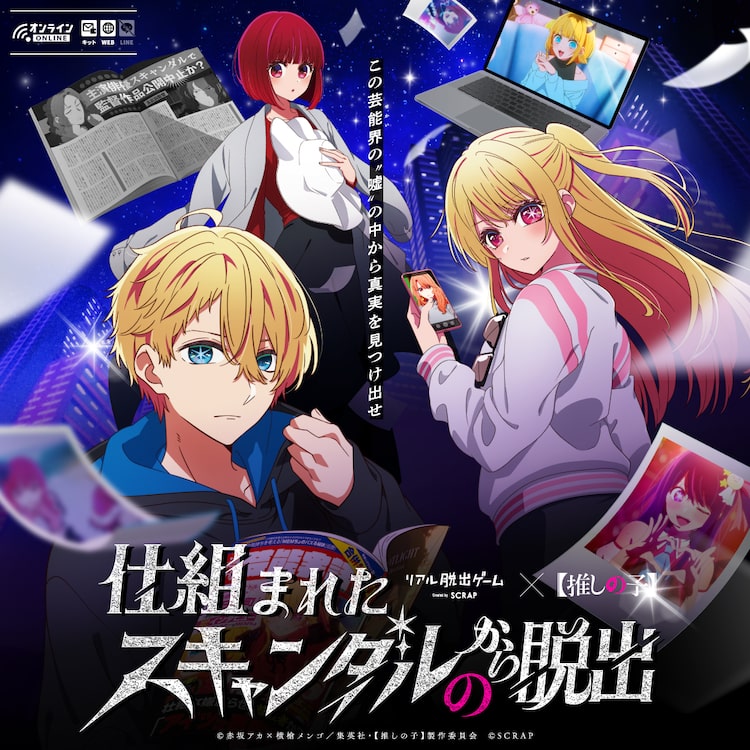 赤坂アカ・横槍メンゴ原作によるTVアニメ「【推しの子】」とSCRAPが初コラボした、オンラインで遊べるリアル脱出ゲームの最新作「仕組まれたスキャンダルからの脱出」が登場。7月19日よりSCRAP GOODS SHOP、アニメイト通販、Amazon.co.jp、楽天市場のほか、リアル脱出ゲーム、アニメイト、ロフトの店舗で一般販売される。