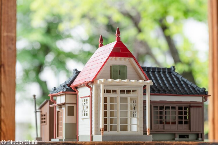 劇中でメイとサツキが引越して来た家を立体化したこのミニチュアハウス。昭和初期頃に建てられ長い間放置されていた古い家の趣を表現するため、ゆがんだ雨どいや色褪せた瓦といった経年劣化を感じさせる彩色やエイジング加工が施された。屋根は取り外すこともでき、内部までじっくり鑑賞できる。