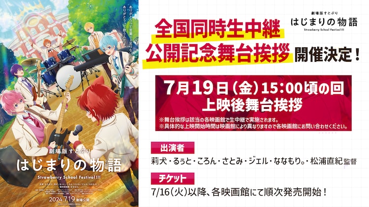 すとぷりが主演を務めるアニメ映画「劇場版すとぷり はじまりの物語~Strawberry School Festival!!!~」の公開記念舞台挨拶が、公開初日の7月19日に全国同時生中継で開催される。