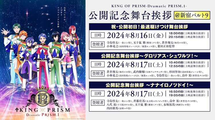 アニメ「KING OF PRISM」シリーズ最新作「KING OF PRISM -Dramatic PRISM.1-」の舞台挨拶が、公開初日の8月16日と17日に東京・新宿バルト9で開催されると明らかに。1週目の入場特典と、本編前に上映される映像についても発表された。