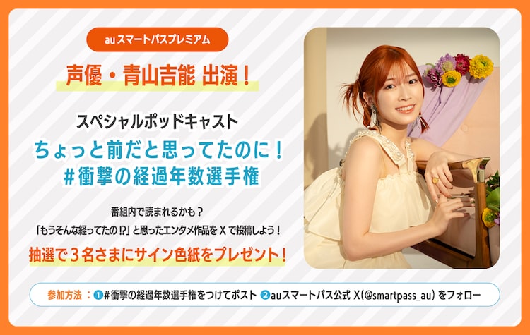 番組内で投稿を読まれた人の中から抽選で3人に、青山のサイン色紙が当たるプレゼントキャンペーンも開催。8月5日11時59分までにハッシュタグ「#衝撃の経過年数選手権」を付けたうえでエンタメ作品と思い出、エピソードをポストし、auスマートパスプレミアムの公式Xアカウント(@smartpass_au)をフォローすることで応募完了となる。