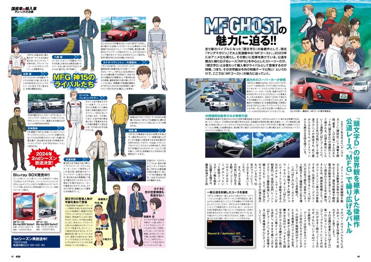 巻頭では「国産車vs輸入車チューンド大決戦」と銘打ち、計7台の国産車・輸入車を比較しながら紹介。ラインナップは「MFゴースト」に登場する車種を意識している。このほかアニメ「MFゴースト」のあらすじや登場キャラクターたちの紹介ページも。さらに「MFゴースト」の世界観や制作秘話について、アニメの公式アドバイザーを務める武井寛史氏が語っている。