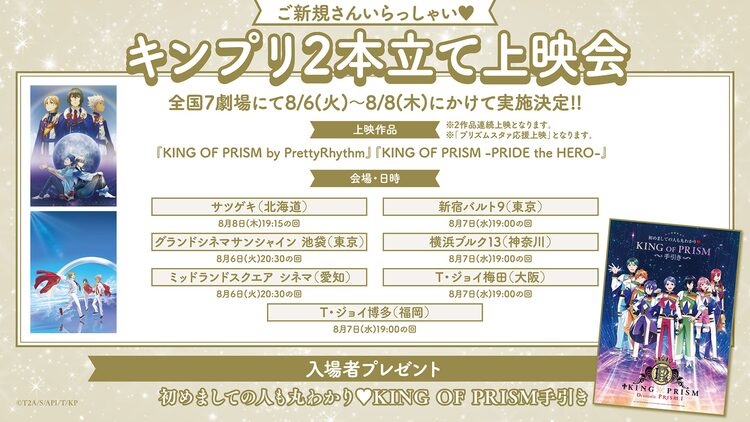 「ご新規さんいらっしゃい♡キンプリ2本立て上映会」では、「KING OF PRISM」シリーズの第1作「KING OF PRISM by PrettyRhythm」と第2作「KING OF PRISM -PRIDE the HERO-」を2本立てで上映。応援上映形式で行われ、入場者特典として「初めましての人も丸わかり♡KING OF PRISM手引き」を配布する。会場は北海道・サツゲキ、東京・新宿バルト9、東京・グランドシネマサンシャイン池袋、神奈川・横浜ブルク13、愛知・ミッドランドスクエアシネマ、大阪のT・ジョイ梅田、福岡のT・ジョイ博多。チケットは各劇場で随時販売予定だ。