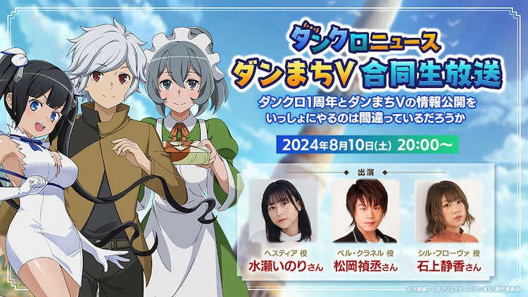 「ダンクロニュース ダンまちV合同生放送 ~ダンクロ1周年とダンまちVの情報公開をいっしょにやるのは間違っているだろうか~」には、ベル・クラネル役の松岡禎丞、ヘスティア役の水瀬いのり、シル・フローヴァ役の石上静香らが出演。番組内では、今秋に放送される「豊穣の女神篇」の最新情報も解禁予定だ。