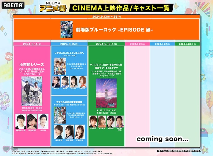 9月14日から23日にかけて開催される「ABEMAアニメ祭」の続報が到着。TVアニメ「しかのこのこのここしたんたん」のキャスト登壇上映会が9月15日に東京・109シネマズプレミアム新宿にて行われるほか、期間中を通して「劇場版ブルーロック -EPISODE 凪-」が上映される。