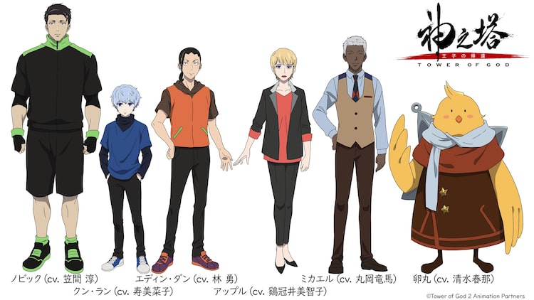 本日8月4日放送の第5話から登場する新キャラクター。十家門出身のエリート・クンの新たなチームメンバーであるノビック役を笠間淳、クン・ラン役を寿美菜子、エディン・ダン役を林勇、アップル役を鷄冠井美智子、ミカエル役を丸岡竜馬、卵丸役を清水春那が務める。また第5話にはクンのかつての仲間・シビスと、過去にクンや夜と行動をともにし、塔を登っていたエンドロシ・ザハードも登場。シビスは江口拓也、ザハードは末柄里恵が演じている。
