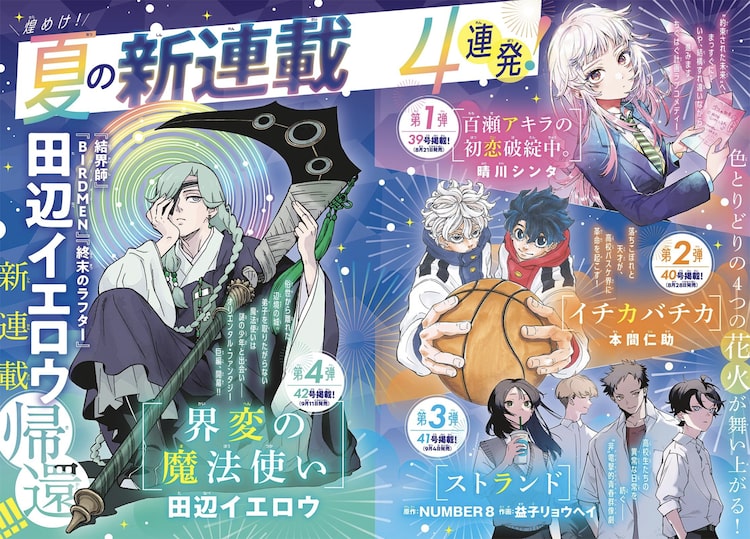 8月21日発売のサンデー39号では「先輩、断じて恋では!」の晴川シンタによるすれ違いラブコメディ「百瀬アキラの初恋破綻中。」が開幕。8月28日発売の同誌40号では、本間仁助が落ちこぼれと天才を描くバスケマンガ「イチカバチカ」、9月4日発売の同誌41号では「BLUE GIANT」のNUMBER8が原作、益子リョウヘイが作画を手がける高校生たちの“非”電撃的青春群像劇「ストランド」がそれぞれスタートする。また9月11日発売の同誌42号では、弟子を取りたがらない魔法使いが謎の少年と出会うところから始まる、田辺によるオリエンタルファンタジー「界変の魔法使い」が始動。今夏始まるサンデーの新連載を読者は楽しみに待とう。