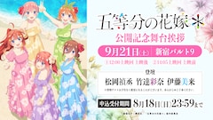 TV放送に先駆け、9月20日より3週間限定で先行上映される「五等分の花嫁*」。春場による原案・完全監修のもと、上杉風太郎と五つ子の「新婚旅行編」が描かれる。舞台挨拶には上杉風太郎役の松岡禎丞、中野二乃役の竹達彩奈、中野三玖役の伊藤美来が登壇。イープラスでは、本日8月8日から18日23時59分までチケットのプレオーダーを受け付ける。
