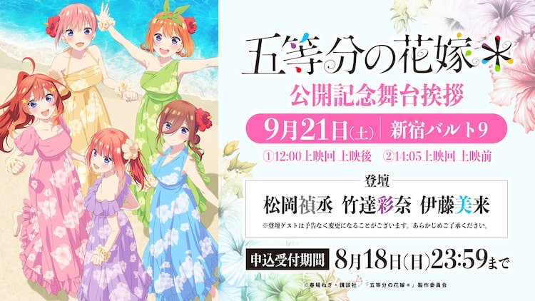 TV放送に先駆け、9月20日より3週間限定で先行上映される「五等分の花嫁*」。春場による原案・完全監修のもと、上杉風太郎と五つ子の「新婚旅行編」が描かれる。舞台挨拶には上杉風太郎役の松岡禎丞、中野二乃役の竹達彩奈、中野三玖役の伊藤美来が登壇。イープラスでは、本日8月8日から18日23時59分までチケットのプレオーダーを受け付ける。
