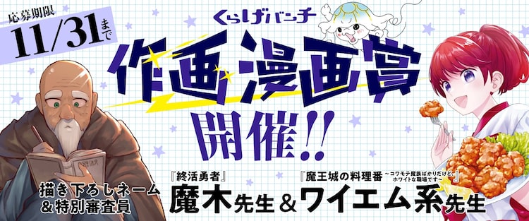 このマンガ賞は「ファンタジー部門」と「オリジナル部門」の2部門。「ファンタジー部門」では、「終活勇者」の魔木または「魔王城の料理番 ~コワモテ魔族ばかりだけど、ホワイトな職場です~」のワイエム系による描き下ろしネームをもとに作画してもらう。「オリジナル部門」は参加者のオリジナル作品が対象に。どちらの部門もキャラや構図、コマ割りなどは自由。また「ファンタジー部門」では魔木とワイエム系が審査員を担当する。
