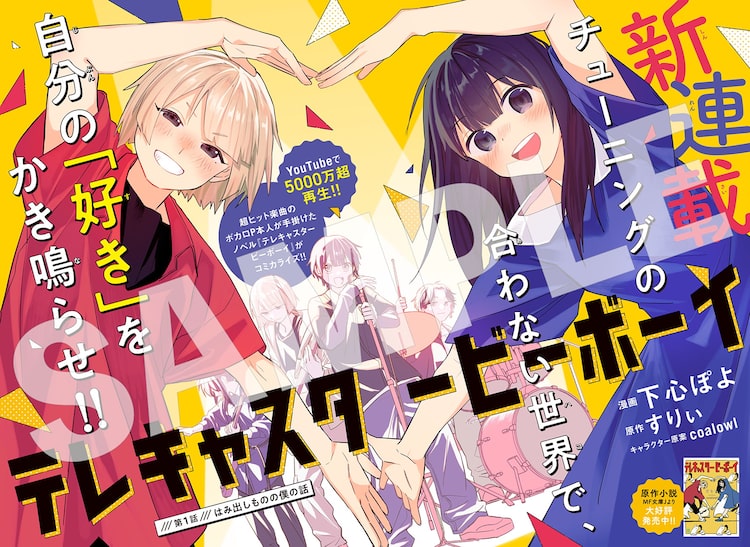 YouTubeで5000万回以上の再生数を誇る「テレキャスタービーボーイ」。マンガ版では、すりぃ自身が手がけたノベル「テレキャスタービーボーイ」を原作に、物語を展開していく。表紙と巻頭カラーを飾っており、表紙イラストをあしらった「オリジナル下敷き」が付録として用意された。