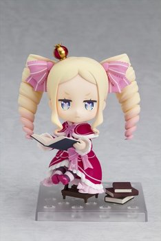 このフィギュアではロズワール邸で禁書庫の司書を務める少女・ベアトリスを、全高約10cmの大きさで立体化。特徴的な瞳や毛先がピンクがかったツインテール、リボンやフリルがたっぷりと付いたドレスなどが細やかに再現されている。表情パーツは機嫌の悪そうな「通常顔」に加え、「怒り顔」「笑顔」という計3種が付属。オプションパーツには彼女が“にーちゃ”と呼ぶ精霊のパック、禁書庫の脚立と書物などが用意された。専用のスカートパーツを使うことで脚立に座らせることもできる。