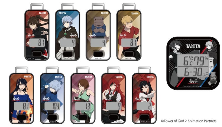 TVアニメ「神之塔 -Tower of God-」とタニタがコラボレート。キャラクターがデザインされたデジタル温湿度計1種と、3Dセンサー搭載歩数計9種が、タニタオンラインショップ限定で販売される。