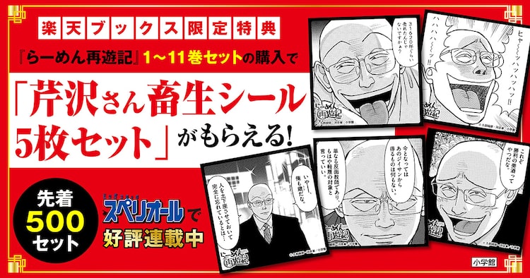 これは「らーめん再遊記」の連載100回を記念して用意されたもの。1~11巻セットは500セットの数量限定にて販売される。なお1~11巻セットには「芹沢さん畜生シール5枚セット」が付属。シールには「ヒャ~ハッハッハッ!! ハハハハ~ッ!!」と高笑いする芹沢や、「人を土下座させておいて完全に忘れているとは…」というSNSでも話題となった芹沢の名言がデザインされている。シールは今回のセット商品でしか手に入らない限定アイテムとなるので、ファンはこの機会をお見逃しなく。