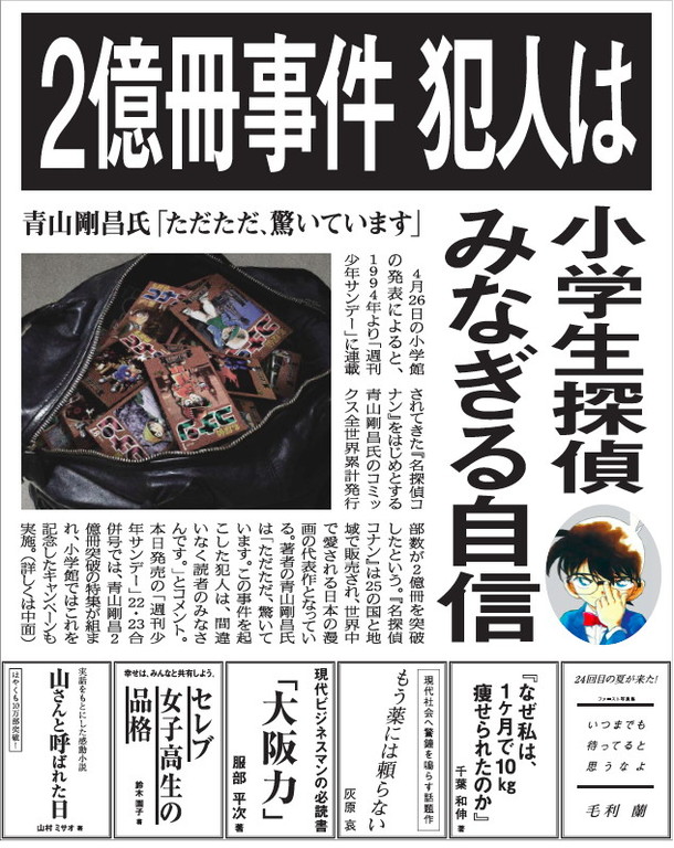 本日4月26日の読売新聞朝刊では、一面広告にてキャンペーンの実施を告知。また都内各所にて号外も配られている。この号外はWebマンガサイト・サンデーうぇぶりでも読むことができる。なお、サンデーうぇぶりでは本日より「名探偵コナン」の人気エピソード「『さざ波』シリーズ」のネームノートを一部公開中だ。