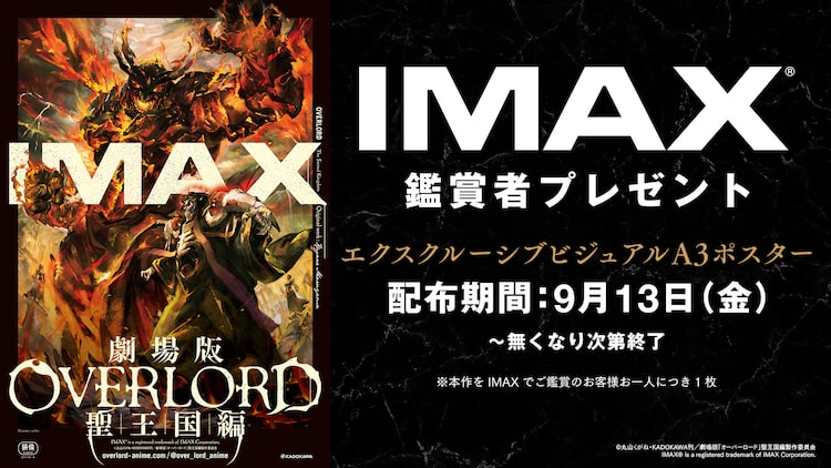 9月13日にIMAX版が先行上映、9月20日より全国公開される「劇場版『オーバーロード』聖王国編」。IMAX版の入場者特典には、キャラクター原案・so-binのイラストを使用した“IMAXエクスクルーシブビジュアル”のA3ポスターが用意された。9月13日から配布され、無くなり次第終了となるため注意しよう。
