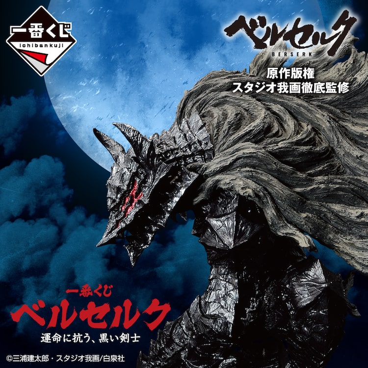 三浦建太郎「ベルセルク」のくじ「一番くじ ベルセルク 運命に抗う、黒い剣士」が、明日9月14日よりローソン、書店、ホビーショップ、一部のゲームセンター、一番くじ公式ショップ、一番くじONLINEなどで順次発売される。