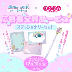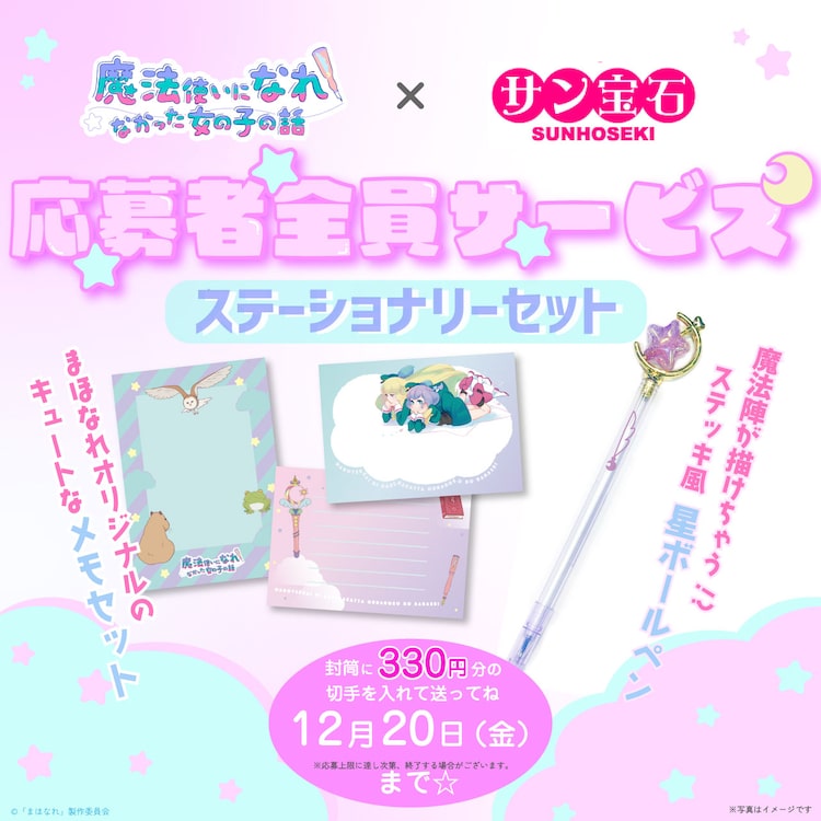 サン宝石とのコラボにより制作された「まほなれ」のステーショナリーセットでは、キュートな絵柄のメモセットと魔法のステッキをイメージしたボールペンを用意。今回展開される応募者全員サービスは、少女マンガ誌などで実施されていた内容を踏襲した形で行われる。必要金額分の切手と、自身の住所などを記入した住所カードを封筒に入れて、指定の宛先まで送付することで応募は完了。募集期間は12月20日までで、当日消印有効となる。応募方法などの詳細は「魔法使いになれなかった女の子の話」の公式サイトを確認しよう。