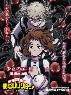 第7期の放送は残すところあと2話となったアニメ「僕のヒーローアカデミア」。10月5日放送の第20話「少女のエゴ」に向けて公開されたビジュアルには、決意を秘めた表情の麗日お茶子と、彼女に襲いかかろうとしつつ涙を浮かべるトガヒミコの姿が描かれた。