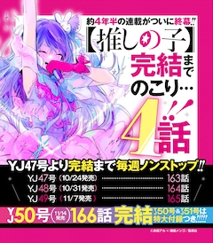 なお本日10月10日発売の週刊ヤングジャンプ45号と17日発売の46号では「【推しの子】」は休載となっており、10月24日発売の週刊ヤングジャンプ47号から50号の最終回まで4週連続で掲載。最終巻となる16巻は12月18日の発売を予定しており、特別カバー仕様でブックスタンドとシールが付属する特装版「【推しの子】16 SPECIAL EDITION」も同時刊行される。加えて作中に登場する「アイ無限恒久永遠推し!!!」キーホルダーの“原作完全再現版”の発売も決定した。