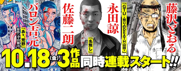 「GTO」「湘南純愛組!」の藤沢による新連載「GTU -怒りのDEATH山田-」は、東京吉祥学苑で副校長として働く内山田ひろしを主人公とした物語。また俳優の佐藤二朗は初のマンガ原作に挑戦し、「名無し」というタイトルで、淡々と殺人を繰り返す男・山田太郎を描く。マンガは「園田の歌」の永田諒が担当する。
