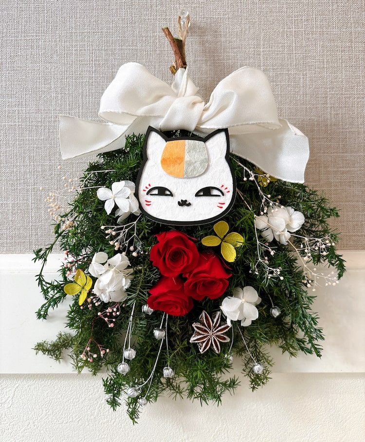 緑川ゆき原作によるTVアニメ「夏目友人帳」に登場するニャンコ先生と斑(まだら)のスワッグが登場。オンラインショップ・動物のお花屋さんマイペリドットで発売されている。価格は税込各6830円。