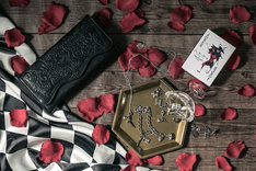 長財布のカラーはブラック。結城中佐がスパイ養成部門D機関のメンバーたちの未来を示唆した言葉「真っ黒な孤独」と、任務を遂行するスパイたちの強靭な精神を表現した色味に仕上がった。内装はトランプのジョーカーの色合いをモチーフに、レッドとブラックのストライプ柄でデザインされている。