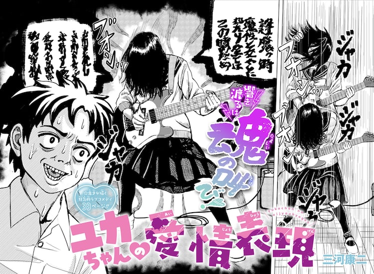 この気持ちは届くのか…愛情表現が独特な少女を描くラブコメ読切がジャンプ+に 2024年10月23日2024年10月23日 editor 「ユカちゃんの愛情表現」扉ページ (c)三河康二/集英社三河康二の読み切り「ユカちゃんの愛情表現」が、本日10月23日に少年ジャンプ+で公開された。 「ユカちゃんの愛情表現」は地味な男子学生・小森くんとクラスメイトの女子・柏原さんを描くラブコメディ。ある日、下駄箱に入っていた手紙で呼び出された小森くんを待っていたのは、ギターを抱えた柏原さんだった。実は小森くんに思いを寄せていた柏原さんは、ギターや和歌でその気持ちを伝えようとしてきて……。愛情表現が独特な柏原さんの気持ちは小森くんに届くのか。 関連記事吉田恵里香が明日放送の「情熱大陸」に出演、世に問い続ける作品づくりに密着愛されヒーローの日常密着コメディ「生活マン」、ジャンプ+で連載スタート「夫を社会的に抹殺する5つの方法」“リブート版”が12月に キャストと世界線を一新「じゃりン子チエ 劇場版」「スペースコブラ」ラグボール編YouTubeで無料配信高屋奈月&横槍メンゴが「幻想水滸伝」シリーズ30周年お祝い、イラスト&コメント公開幾原邦彦による寺山修司の詩集発売、カバーイラストは横槍メンゴ描き下ろし Tweet
